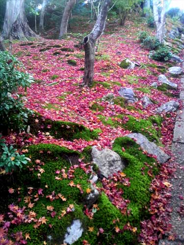 石垣の階段の両サイドには紅葉の赤じゅうたんが。